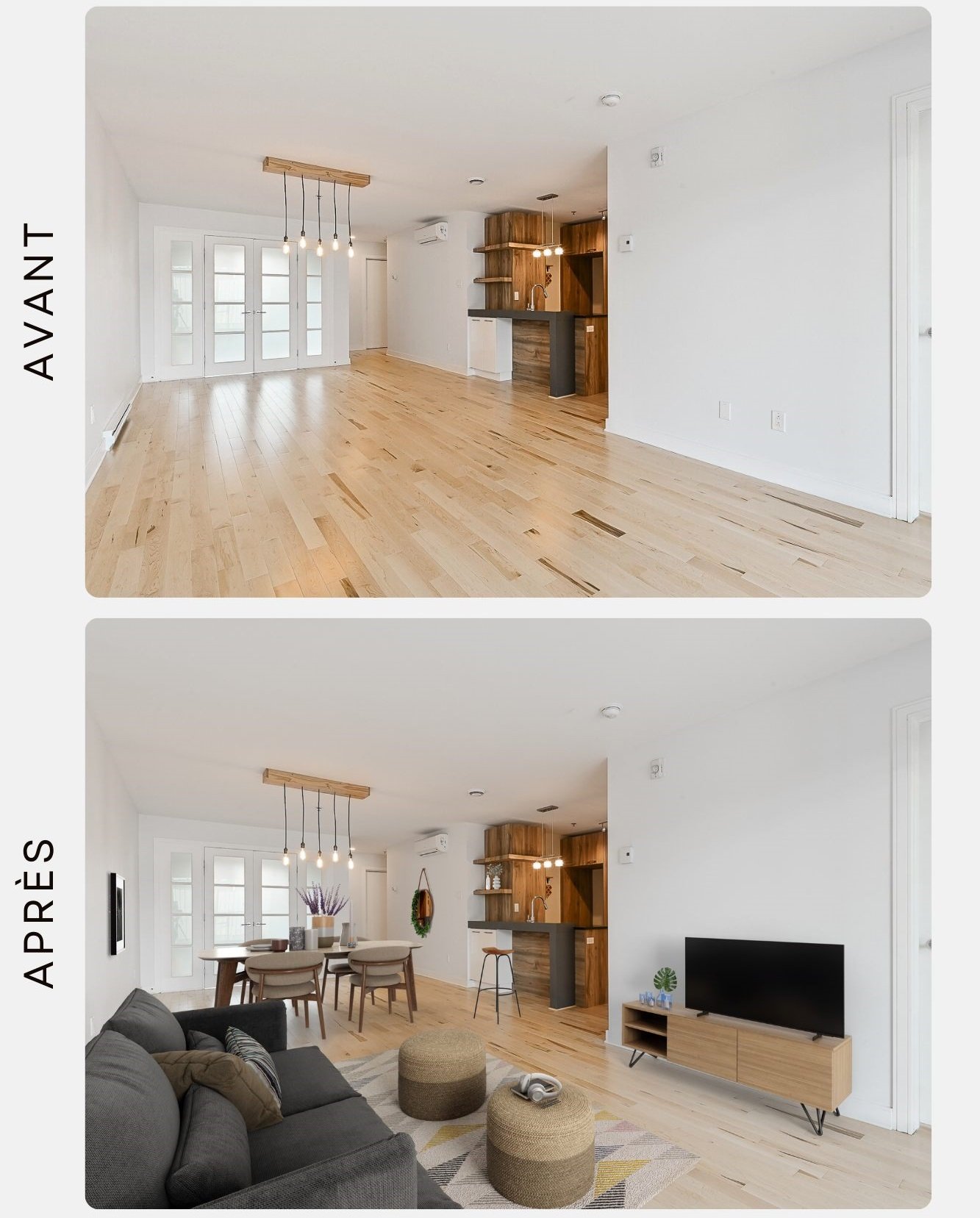 L’aménagement virtuel, (home staging virtuel), rend possible la compréhension d’un espace vide. En me servant d’une photo de cet espace, je peux intéger du mobilier et des articles de décoration. Cette technique est très réaliste et permet d’imaginer le quotidien dans un lieu inhabité.